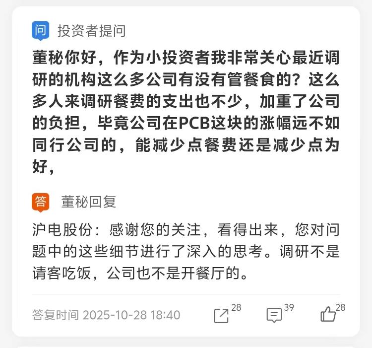 海报新闻记者沉童报道,某PCB公司董事会秘书的尖锐回应“调研不是请客吃饭,公司不开饭馆”,引发市场对机构调研规范性和上市公司接待成本的关注。直接、风趣,是68岁董事会秘书的一贯作风。 “董事会秘书您好,作为一个小投资者,我关心的是,最近很多机构都被审核了,有食品管理吗?很多人在食品上检查,花了很多钱,增加了公司的负担。” 10月28日,有投资者向上海电气股份有限公司(002463)询问一个看似微不足道却很实际的互动平台问题。沪电电气董事会秘书的回应简短而尖锐:“感谢您的关注,这说明您对问题的细节进行了深入的思考。调研不是请客吃饭,公司也不是开餐厅。”记者注意到,这并不是沪电电气董事会秘书第一次以直接、幽默的方式回答投资者提问。从回应投资者建议公司利用Deepseek热点,表示“既不想学习,也不后悔”,到直接拒绝公司回应“如果公司考虑收购英伟达”,沪电董事会的互动风格在A股市场独树一帜。当面对投资者关于高管年龄的疑问时,68岁的ld董事会秘书李明贵曾幽默回应:“公司管理层不是迪斯科表演……”当投资者想要指导董事会秘书并反复询问他的命令时,董事会秘书也比较有个性,并建议投资者“继续问,不相信,所以最好离开”。当投资者要求公司停止给员工增加收入时,秘书长回答说:这是一个笑话,不要开玩笑说打工人。这也体现了公司管理层注重业务实质而不是市场炒作的态度。智能响应背后:AI驱动公司产能扩张。值得一提的是,这位投资者的质疑毫无根据。作为PCB(印刷电路板)行业的龙头企业,上海电气股份有限公司凭借其卓越的技术优势吸引了大量机构的关注。近年来由于引入了AI服务器和高速交换轨道,性能表现突出。秘书长回应的当天,上海电气股份有限公司交出了一份不错的成绩单。 2025年第三季度,公司实现营业收入50.19亿元,同比增长39.92%;归属母公司净利润10.35亿元,同比增长46.25%,单季度利润再创新高。整体看前三季度,公司实现利润135.12亿元,同比增长49.96%;归属于母公司净利润27.18亿元,同比增长47.03%。上海电气之所以能够吸引大量机构的调查,主要得益于其在人工智能相关产品上的强劲表现。 2025年上半年,公司通信板块实现营收约65.32亿元,同比大幅增长约70.63%。其中,AI Server和HPC相关PCB产品同比增长约25.34%,占比23.13%。最值得关注的是高速网络交换机及其配套产品,路由关系成为公司增长最快的板块,同比增长约161.46%,占比53.00%。开元证券分析师表示,“人工智能领域的强劲需求一直是公司营收和盈利快速增长的重要驱动力。”为满足人工智能带来的高端产品需求,上海电气积极拓展高端产能。据悉,总投资约43亿元的“公司人工智能芯片配套高端印制电路板扩产项目”已于2025年6月下旬开工建设,预计2026年下半年开始试运行。同时,上海电气泰国生产基地的AI服务器和交换机已获得两家客户的正式认可,另外四家客户的认证和产品导入工作也持续推进。信达证券分析师莫文宇表示:“公司是计算产业链的关键股,机构对上市公司的研究包括哪些内容?此外,很多投资者都好奇机构对上市公司研究的具体流程和步骤,是否包括食品成本等问题的研究。”某领先证券公司研究员在接受新闻记者发帖采访时表示:“一般情况下,上市公司会根据研究时间和节奏来安排工作餐,但大多数机构的工作人员都没有安排工作餐。”不特别注意它。调研的主要部分是了解公司的经营状况。” 曾就职于国内某领先私募股权投资机构的刘女士向记者透露,上市公司机构的标准流程包括预约登记、现场沟通、走访。作为买方机构,相比卖方机构,由于后期要真金白银地投资一家公司,调研周期较长,其中还可能包括暗访和市场调查。在整个调研活动中,被调查企业的伙食安排并不是行动规定的,更多的是公司总体提供的便民服务,在A股市场上,受到大量机构频频调研的公司,通常都是在特定领域优势突出或者处于行业前列的公司,正是因为上海电气在AI算力基础设施领域走入了人们的视线。已成为机构关注的焦点。主编:杜轩 发言时请遵守新闻评论服务协议。
