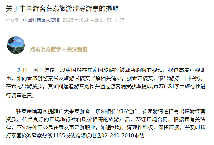 中国驻泰国使馆官方账号截图↑14日,中国驻泰国使馆就中国游客前往泰国旅游相关事宜发出警告:近日,一段中国游客在泰国旅游时购物受到威胁的视频在网络流传。我使馆高度重视此事,已向泰国旅游警察和旅游局确认相关情况。据泰方核实,该导游持有中国护照,在泰国没有导游资格。它试图强迫游客购物,并从游客的消费中赚取佣金。泰国对旅行社进行检查并追究责任。驻泰国使馆再次提醒赴泰游客不要轻信“低价游”。团体旅游请选择具有合格旅游经营资质、信誉良好的正规旅行社,并提供旅游产品确认质量和价格相匹配,并签订正式合同。根据泰国相关法律,外国人不得在泰国从事导游职业。如遇到纠纷,请合理维权,保留证据,并及时拨打泰国旅游警察热线1155或使馆领事保护热线02-245-7010寻求帮助。据媒体报道,10月13日,有网友发布一段视频,声称在泰国旅游时遭遇强制消费。导游一脸得意的点头行为,并威胁中国游客“不花钱就回不了中国”、“到了免税店就不能上车”。他还指着拍摄者要求“删除视频”。来源:中国驻泰国大使馆、人民网、红星新闻 主编:张炬 发言请遵守新闻评论服务协议
