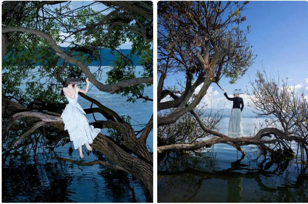 洱海网红“歪脖子树”疑似被人为砍伐。以前排队拍照需要两到三个小时
