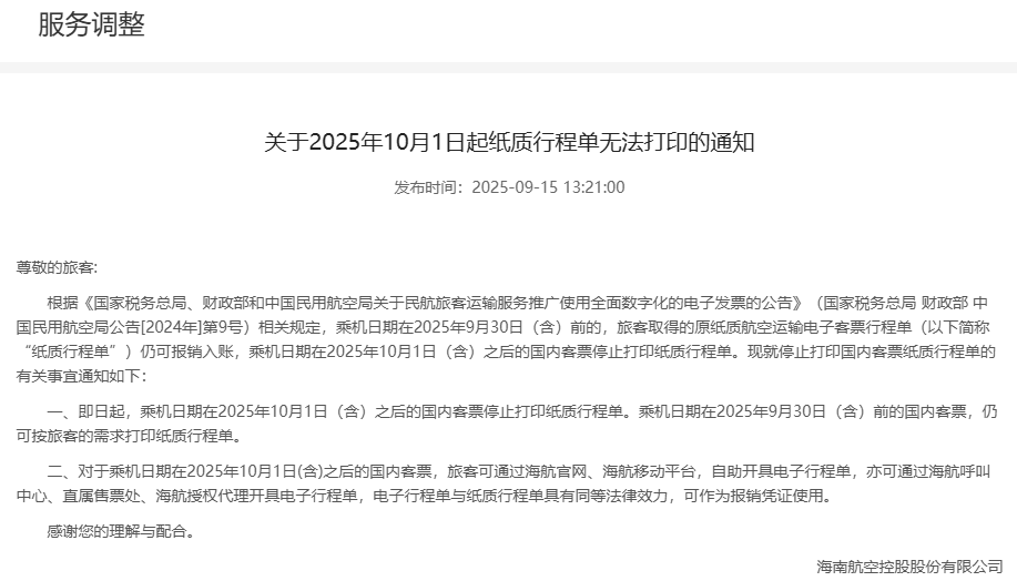 遵循铁路的“纸纸”完全落后,一些飞机最近发布了通知,以阻止行程打印纸张。 9月15日,海南航空公司的官方网站发布了“通知2025年10月1日从2025年10月1日开始打印纸行程的通知”。海南航空筛选网站的官方网站表示,根据“国家税收宣布,财政部,财政部和中国民航局在促进和使用日期的2025年9月30日之前(包括)(包括)的行程(包括)的行程(包括原始纸张运输纸(包括“纸”的薪水),一名薪水和录音的一名行动,该行程的规定是,一名薪水和录音是一名薪水和录音。 Chao News的记者称,Hainan Airlines告诉记者,即使您从10月1日开始购买国内航班(同伴),也无法打印该行程。阿特飞行,而不是购买日期。 “如果一名乘客在10月7日购买当天的国定假日的返程票,他将不再打印纸行程。”如果需要还款,该怎么办?客户服务表示,对于国内机票,航班日期是在2025年10月1日之后(包括),乘客可以通过HNA和HNA移动平台的官方网站或通过HNA呼叫中心,直接售票处和授权的HNA代理发布电子行程。 “论文的电子行程和行程都具有相同的法律效果,并且可以用作报销代金券。”记者咨询了中国航空,中国东部航空公司,Xiamen航空公司和其他飞机,他们收到的回应是:在今年10月1日之后的飞行日期将停止印刷文件。航空运输服务的报销凭证,也不是机场入住方法和安全检查的必要代金券。民用transp我所在国家 /地区的矫正发票,包括发票号,发票状态,行程信息等。在购买了购买的机票的所有行程之后,乘客可以通过官方网站,服务电话号码和其他航空或代理机构运输公司渠道获得电子行程。空中或代理运输公司实际上是根据乘客等提供的消费名称发布的电子行程订单,并通过官方网站和其他方式向乘客交付电子行程。电子行程设置了一个从2024年12月1日到2025年9月30日的过渡期,这是纸和电力的平行时间。如果飞行日期是在2025年9月30日之前,则乘客和单位仍然可以使用Oripaper行程来付款,并根据法规计算减少的税款输入。说纸质账单,人们从10月1日起缺少他们缺少的东西,Transpor的纸质付款代金券铁路乘客的货币也将完全撤回。记者打电话给铁路12306,发现铁路部门将在10月1日之后没有火车票。然后提供纸质报销凭证。对于某些没有智能手机或使用智能手机不好的乘客,他们仍然可以在自助机器上打印出行程信息,其中包含诸如拆除火车乘客的时间,车站拆卸,座位号,售票门等的时间,以便在任何时候轻松查看。图像来源:根据铁路部的先前规定,中国铁路将从2024年11月1日开始在全国范围内进行全面的全面服务。如果需要偿还乘客,他们可以在线申请电子发票,而无需去车站或自助服务售票机票销售(即打印票证)。电子发票的过渡期是11月1,2024至2025年9月30日。转移期后,使用纸质付款券的使用将完全停止。这意味着,无论是铁路还是民航,未来旅程的新阶段都将正式启动。社交平台上的“回忆杀死”已经开始。 “目前,一位想收集火车门票的大学生是伤心欲绝的。“在网民“ Le'er”的眼中,火车票是旅途中不可或缺的组成部分。镇上的梦想,充满希望和犹豫不决。并返回那个熟悉的地方。 “勒尔说。”对于许多人来说,纸列票是对青年的真正记忆。 “网民”“宾·贝宾”说,当付费时,有人在黎明前搬到了等候的大厅里占领了椅子。当我拿到票并看着拆除站,到达站,到达站以及在这里打印的时间时,我真的感觉到了“拆除”的现实。在房屋之间来回旅行的工人中,学生的焦虑是第一次团结一致,还亲眼目睹了山和海洋的婚姻。